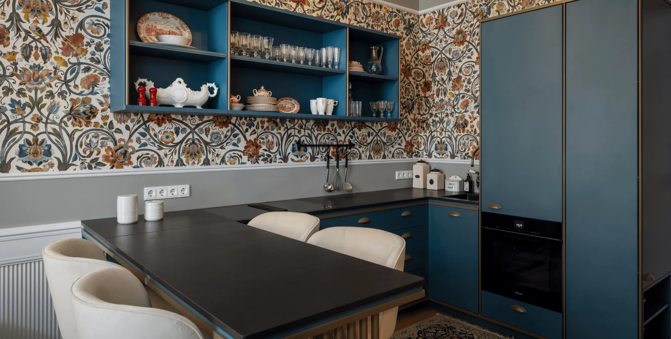 Im Design des Küchentisches wird das Petrol der Tapete geschmackvoll weitergeführt.