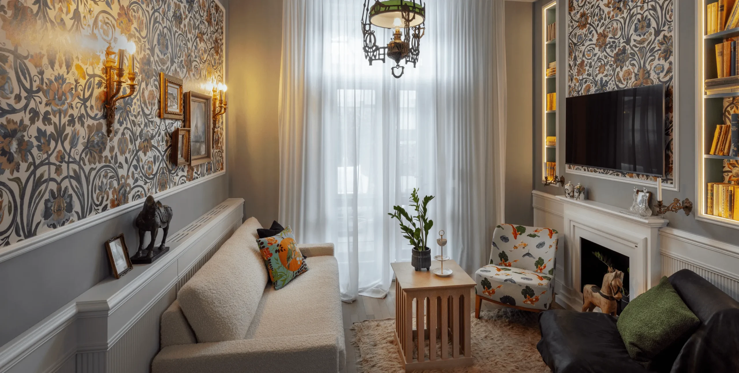 Damit der Wohn-Ess-Bereich größer erscheint, wurde der Zugang zum Schlafzimmer durch eine Tapetentür verborgen.