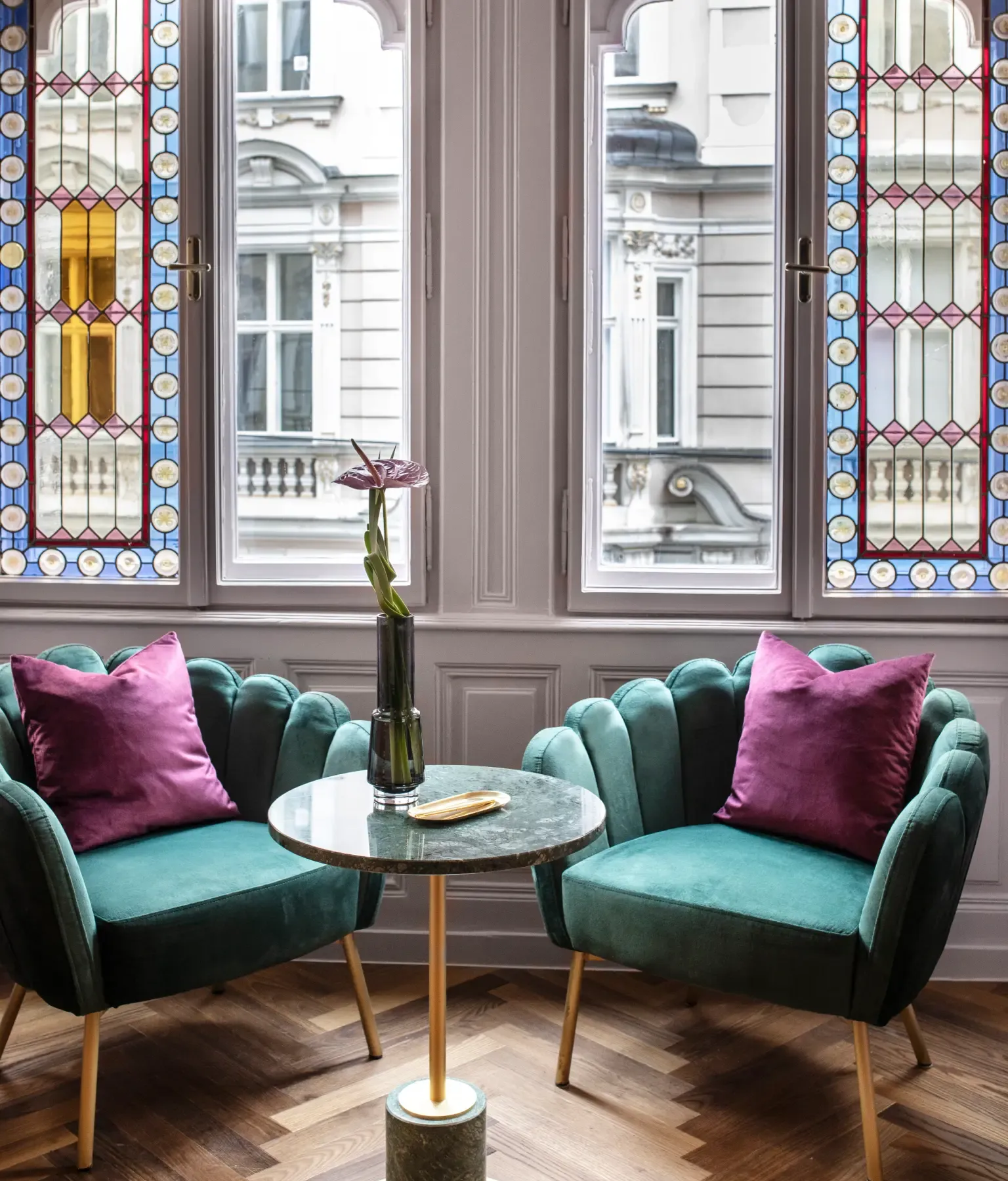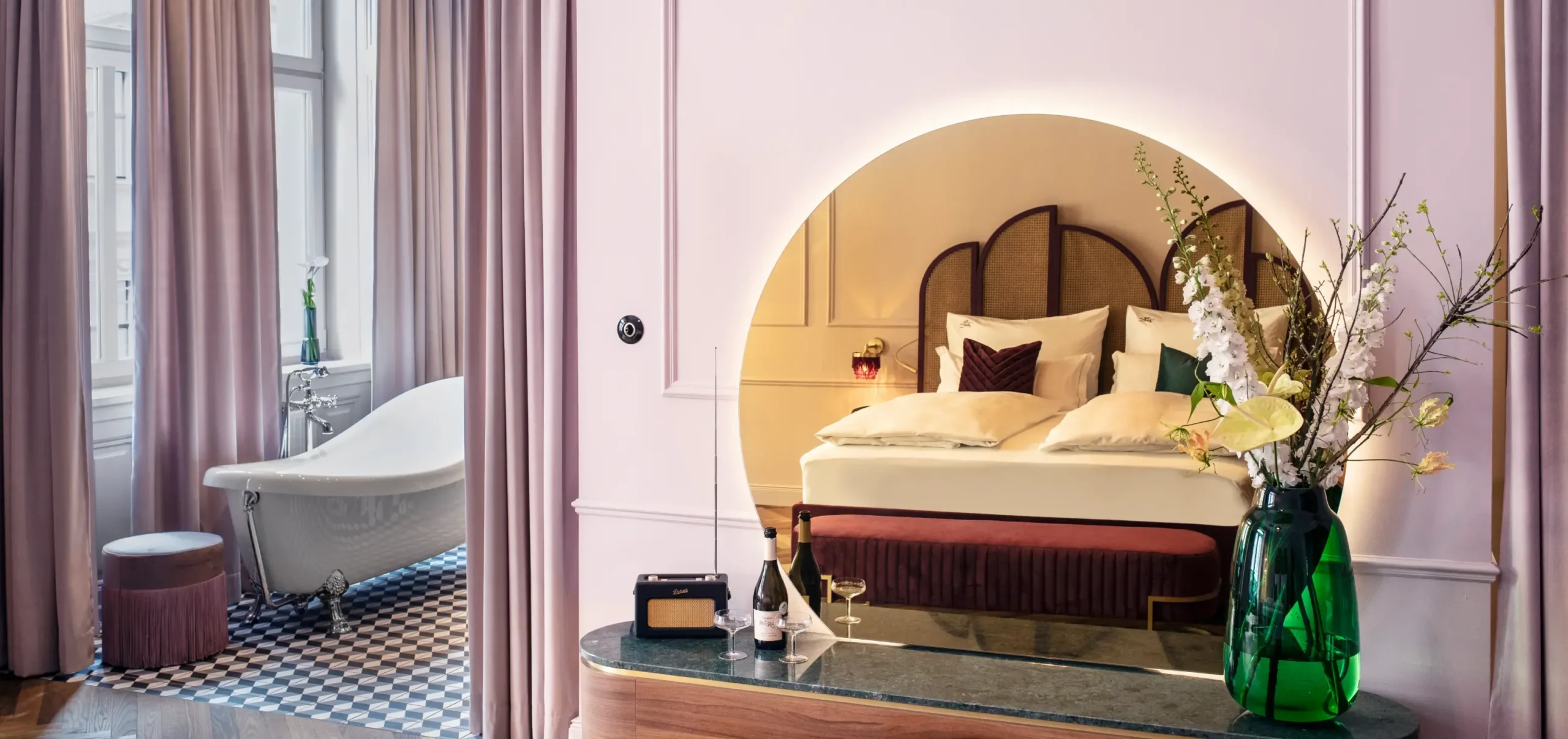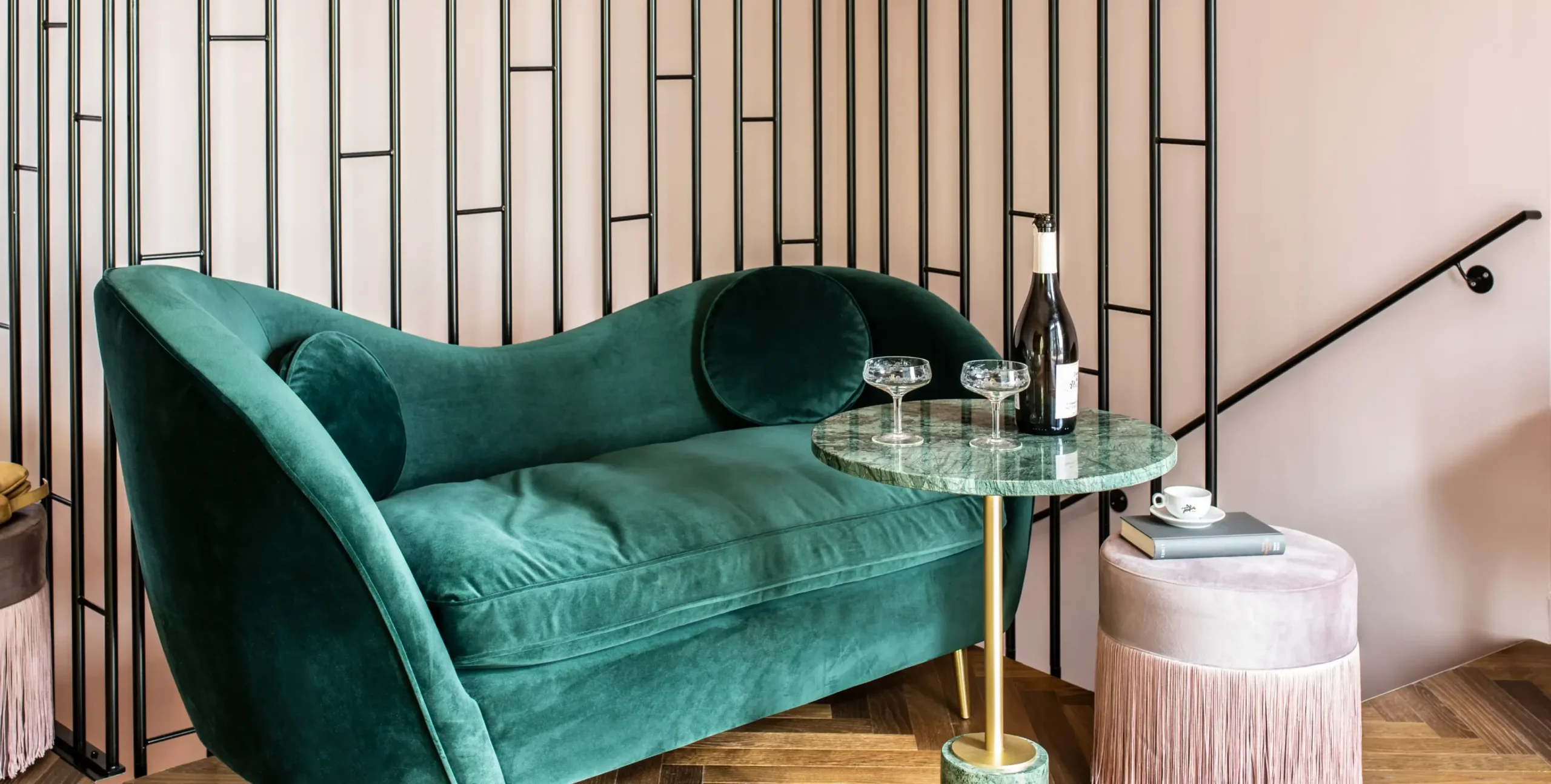 Samt, Messing, grüner Marmor und Details wie der goldene Spiegel von Ben Reyer schaffen eine edle Wohlfühlatmosphäre.