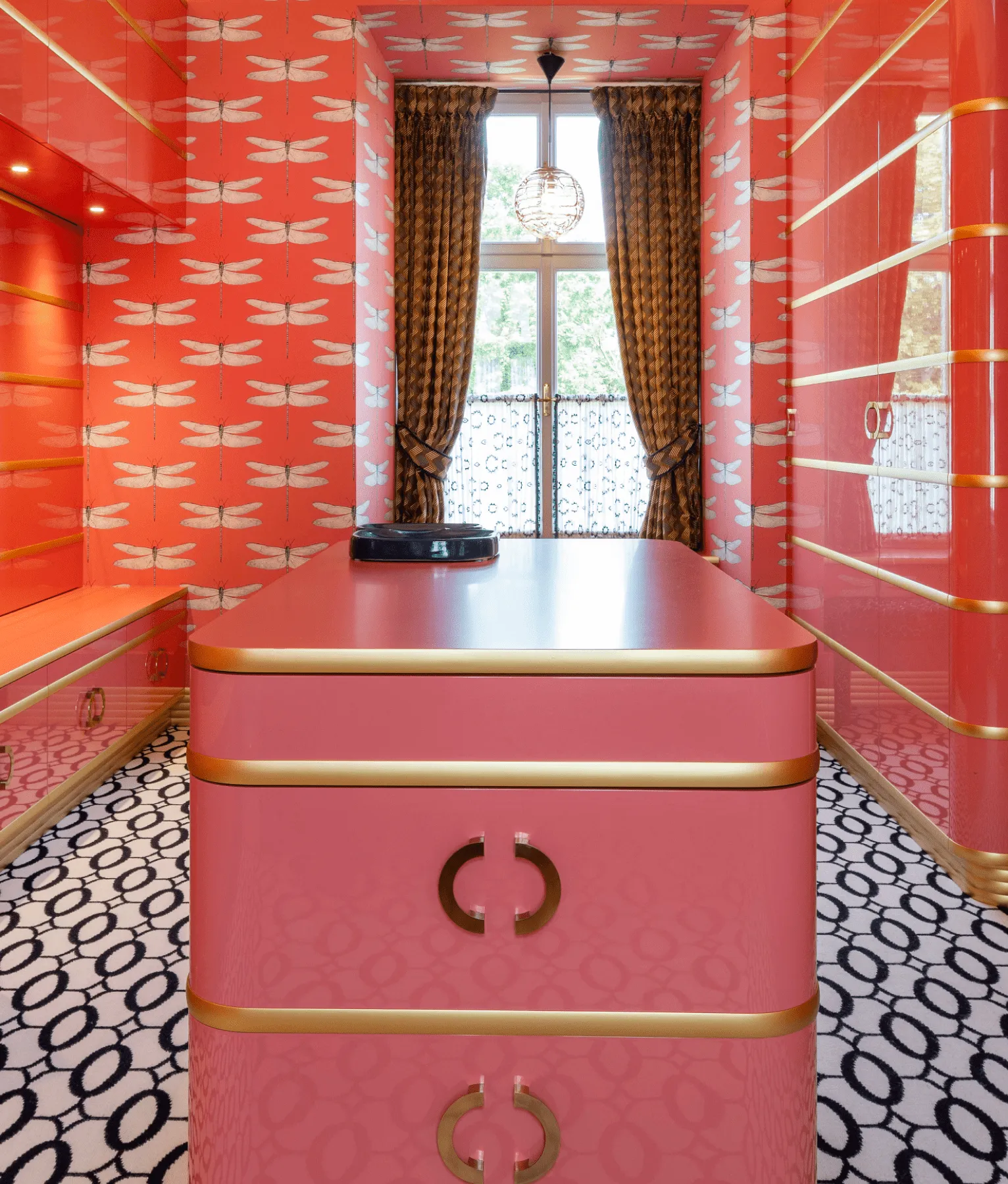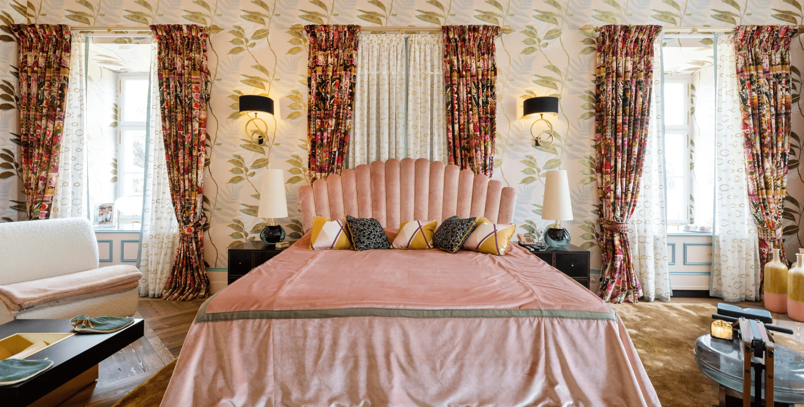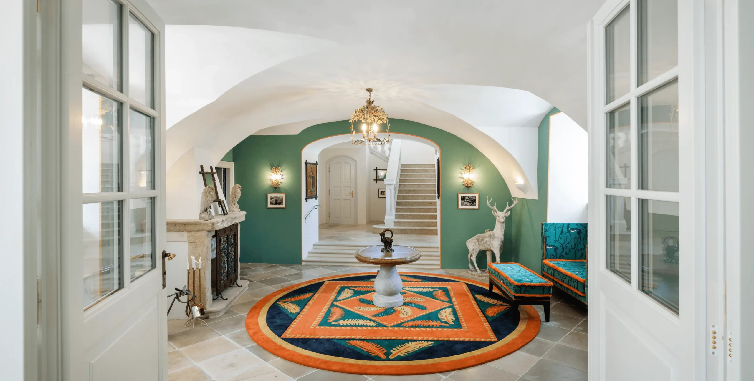 Anstatt des traditionellen Geweihs hängt über diesem Kamin nicht nur eine Zeichnung aus der Sammlung der Hausherren, sondern auch ein künstlicher Haifischkopf.