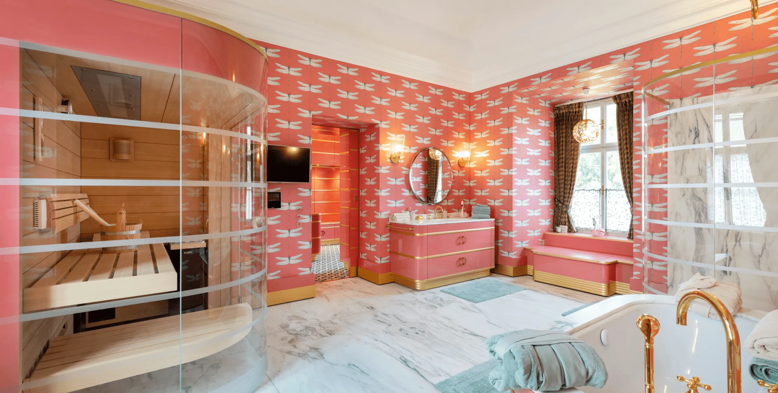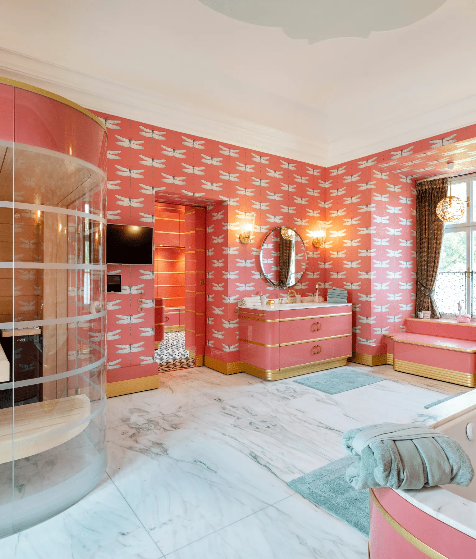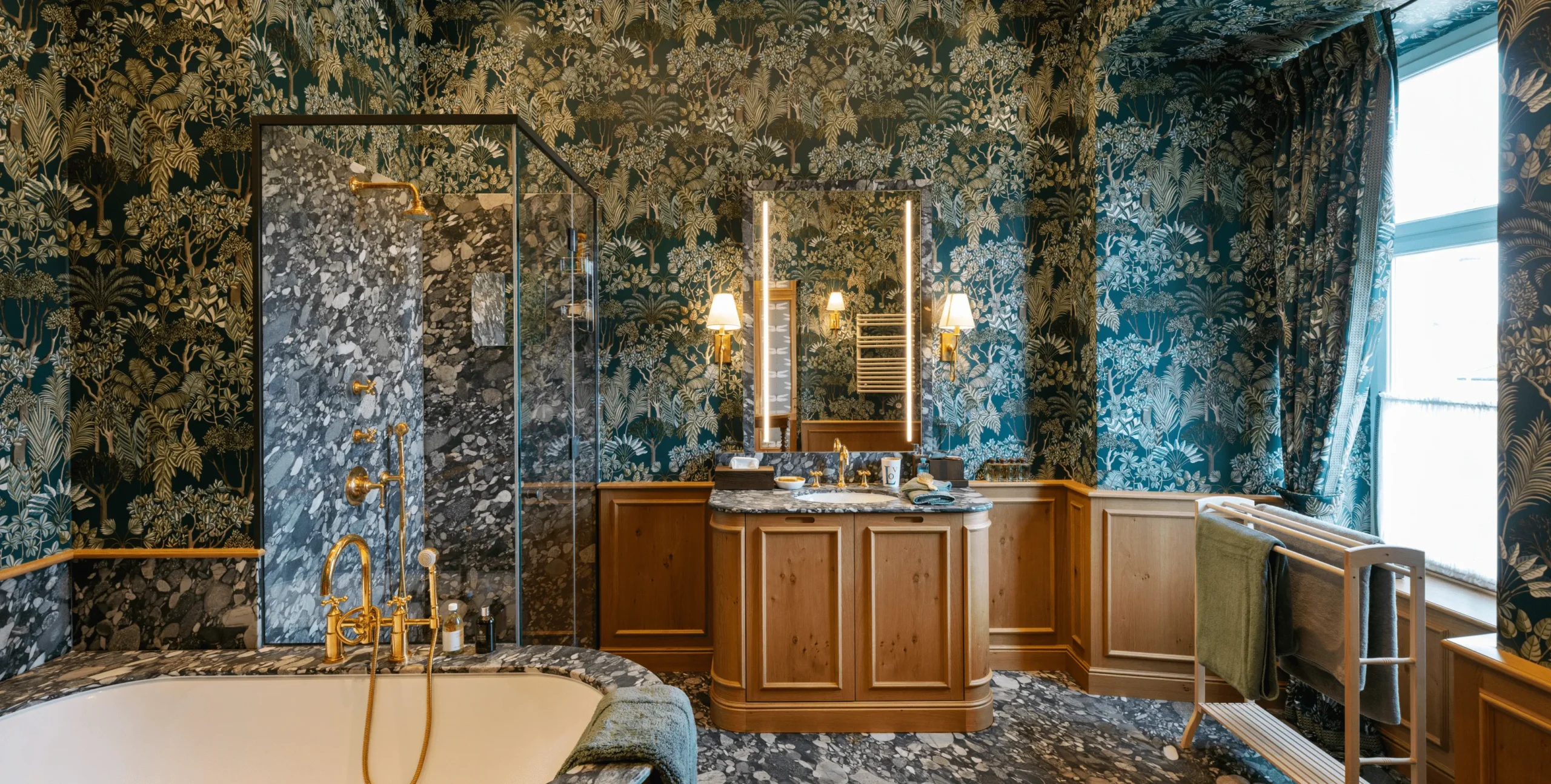 Der individuell entworfene Waschtisch und der speziell gefertigte Spiegel tragen das Jagdthema gekonnt ins Badezimmer.